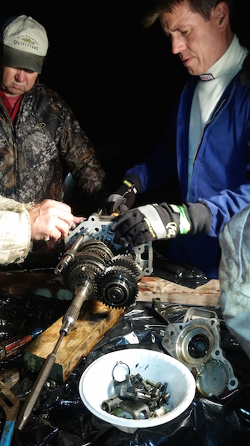 Then we decided to test a little more and the transmission failed at 5 pm Friday. Good news! We had a spare, or so we thought. At 6 pm when the spare arrived it sounded like a piggy bank. All kinds of things were rattling around in there. So there we were, 14 hours from the starting line, and no transmission.